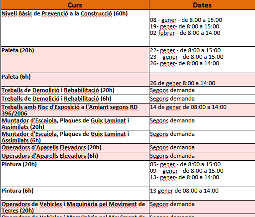 Per qualsevol altre curs que necessiti i no estigui en aquesta taula, no dubti en preguntar-nos per correu electrònic a formacio80@safetywork.cat o trucant al telèfon 93 245 67 85, de dilluns a divendres de 8:00 a 13:00// 15:00 a 18:00